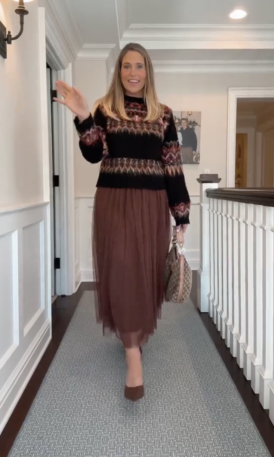There’s something about mixing cozy textures with a touch of romance that feels perfect for the season. We love how the fair isle sweater balances beautifully with the flowy tulle skirt. It’s a look that transitions seamlessly from daytime get-togethers to evening celebrations, especially when paired with a classic bag and simple heels.