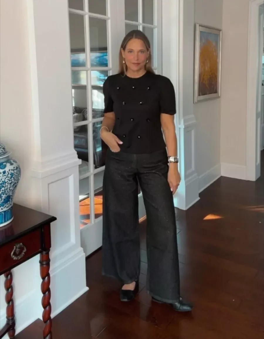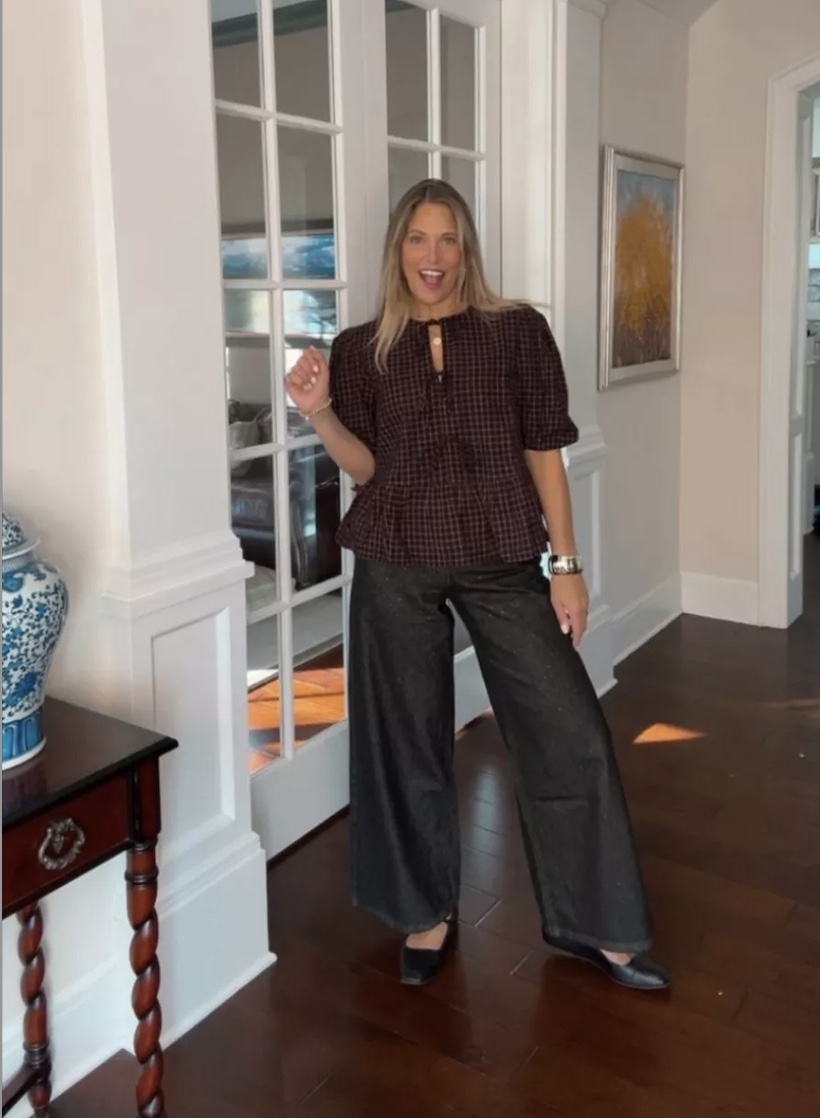 Wide-leg trousers instantly make any outfit feel put together, even when the vibe is casual. We love pairing them with a textured top like a plaid blouse or a knit with button details. The result feels easy but polished, perfect for hosting dinner or relaxing with family at home.