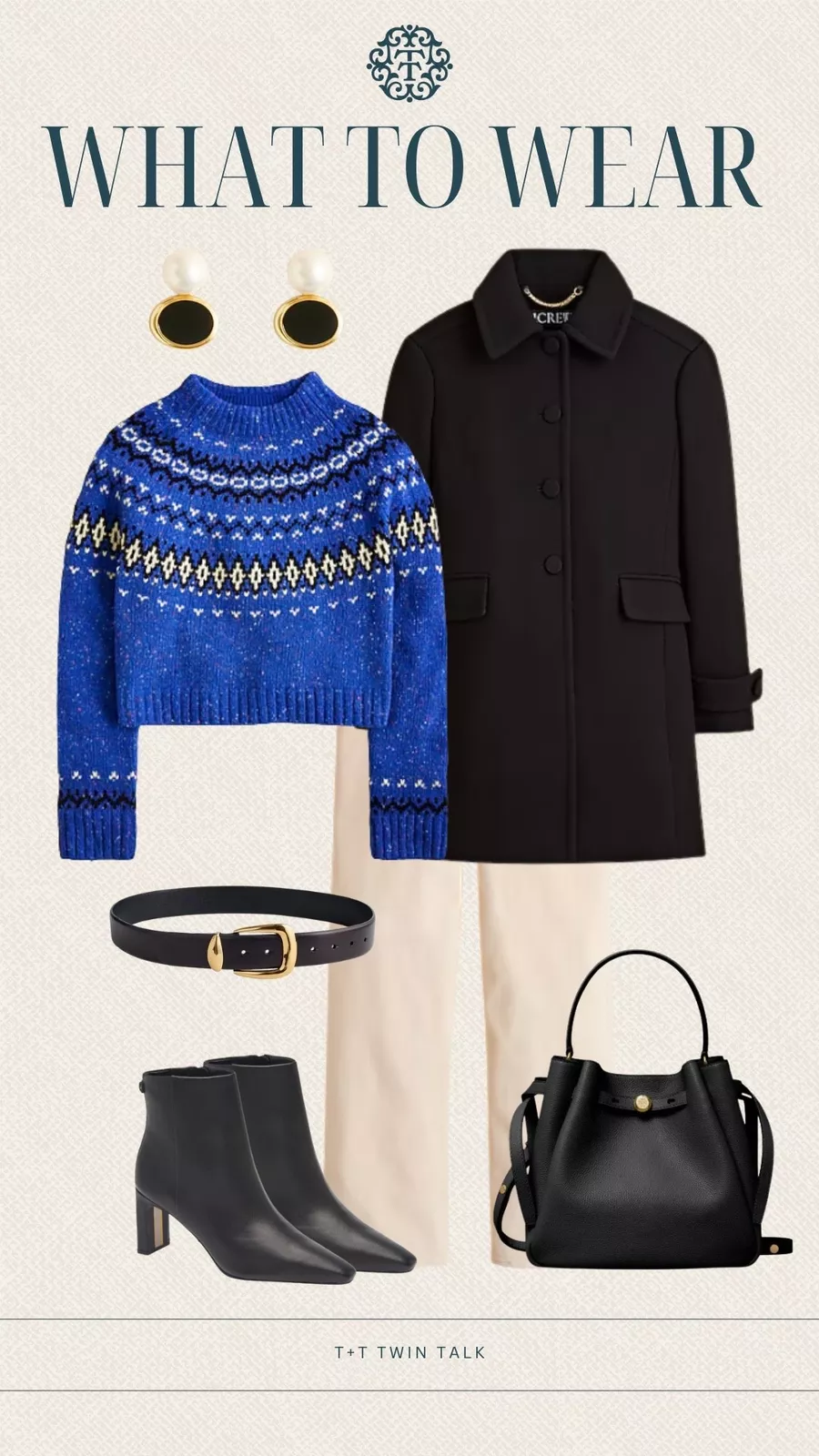 A fair isle or patterned knit paired with classic trousers is the kind of outfit that feels cheerful but not over the top. We love this look for a cozy lunch date or afternoon coffee catch-up — it’s festive in the most subtle way.