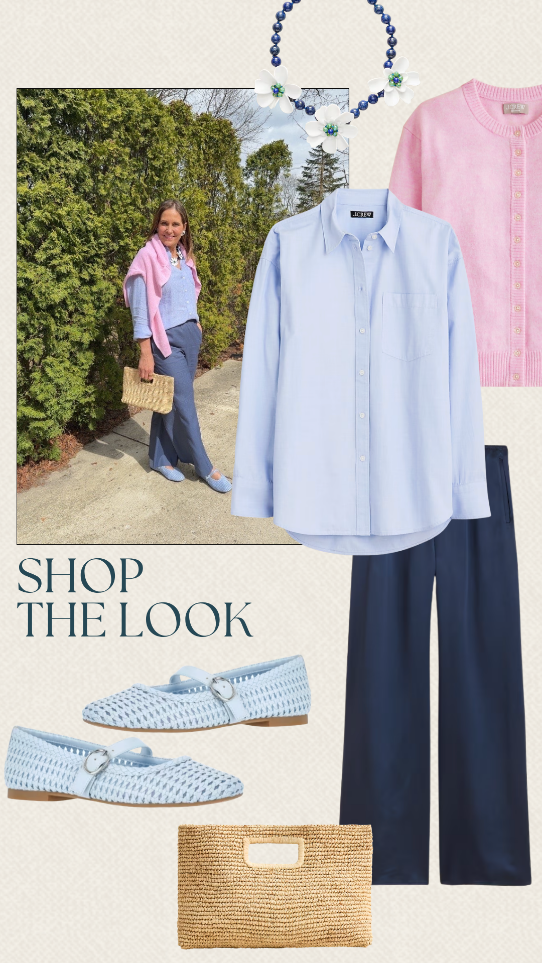 There is something so chic about layering shades of blue with a pop of pink over the shoulders. These J.Crew Cosmo Pants in navy paired with baby blue flats make for the most comfortable, polished look for a sunny afternoon by the water.