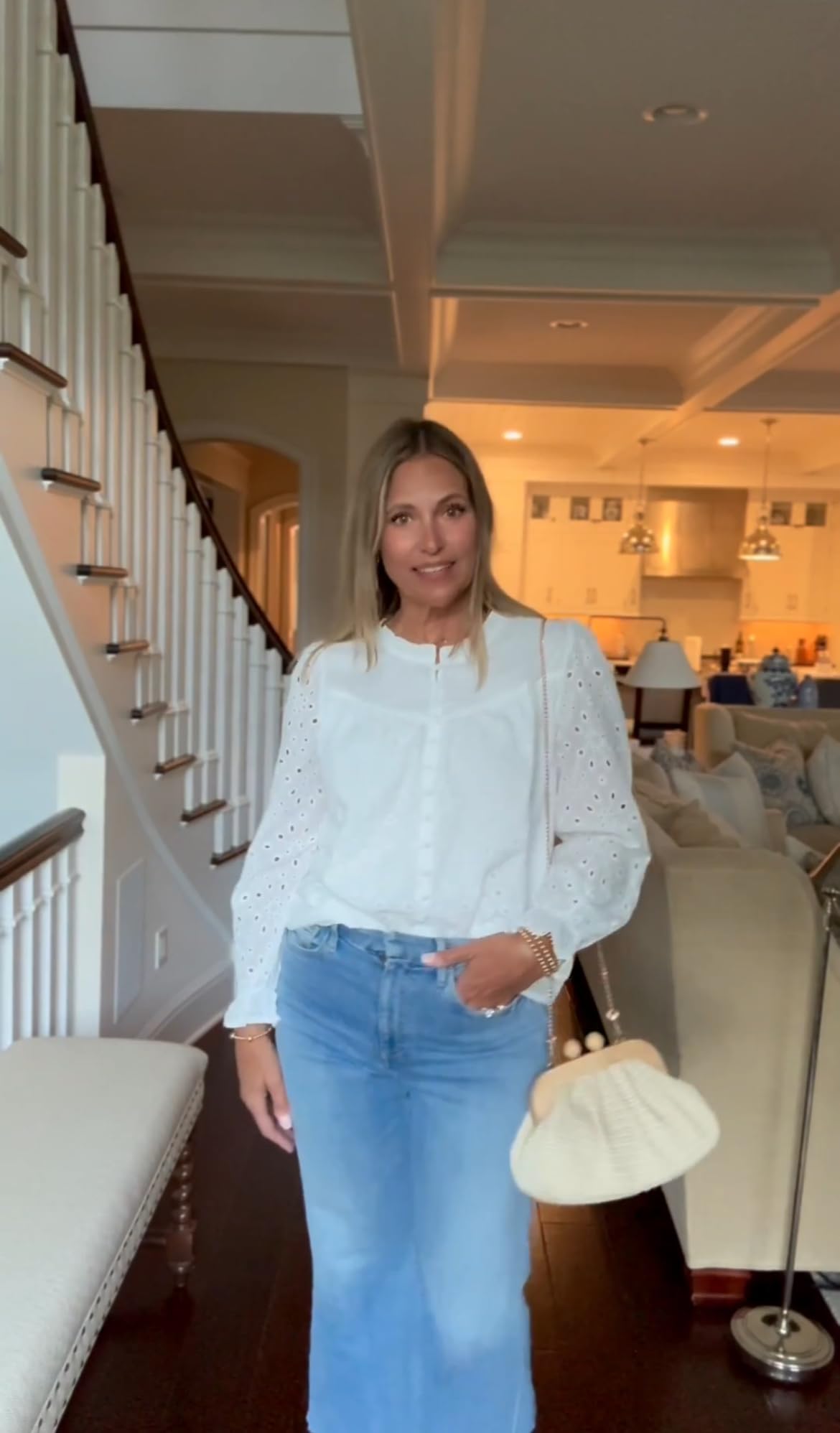 The eyelet blouse paired with wide-leg denim feels effortless but styled. The sleeve detail and subtle texture make the blouse look far more expensive than it is. With modern wide-leg jeans, the whole look feels current and flattering. It’s the perfect elevated everyday outfit.