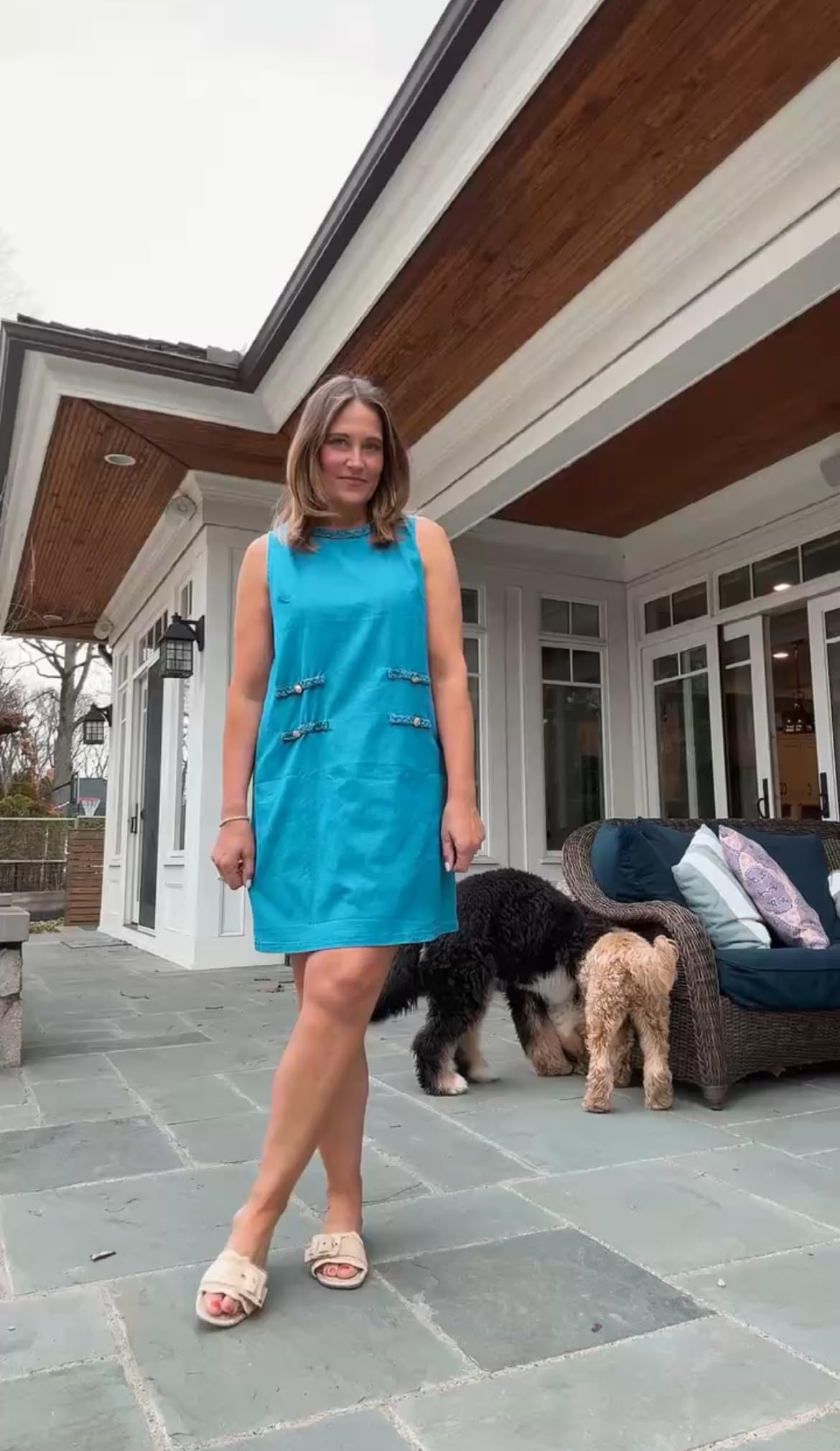 This teal shift dress is simple in the best way. The clean lines and tailored silhouette give it an understated sophistication that feels expensive. We would wear this to lunch, a casual office day, or a weekend outing. Add neutral slides and gold hoops and you’re set.