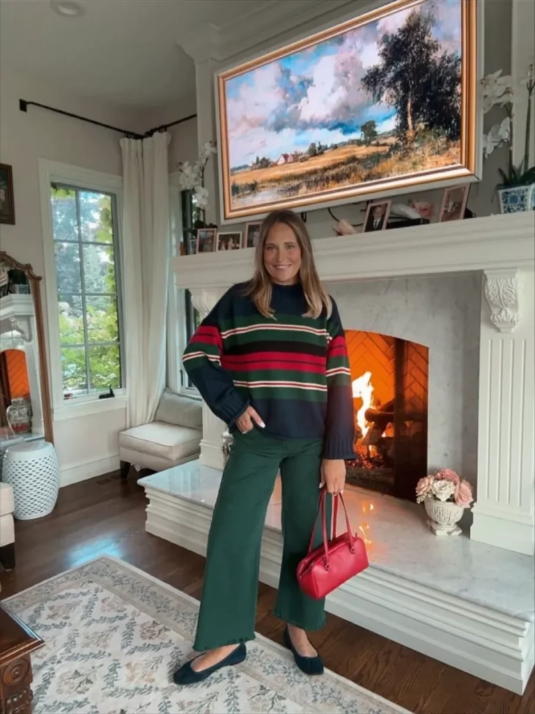Looking for some preppy outfit inspiration? This striped rollneck sweater from J.Crew is such a standout piece for fall. We styled it with green wide leg pants and a red leather purse, making it the perfect look for a preppy fall brunch.