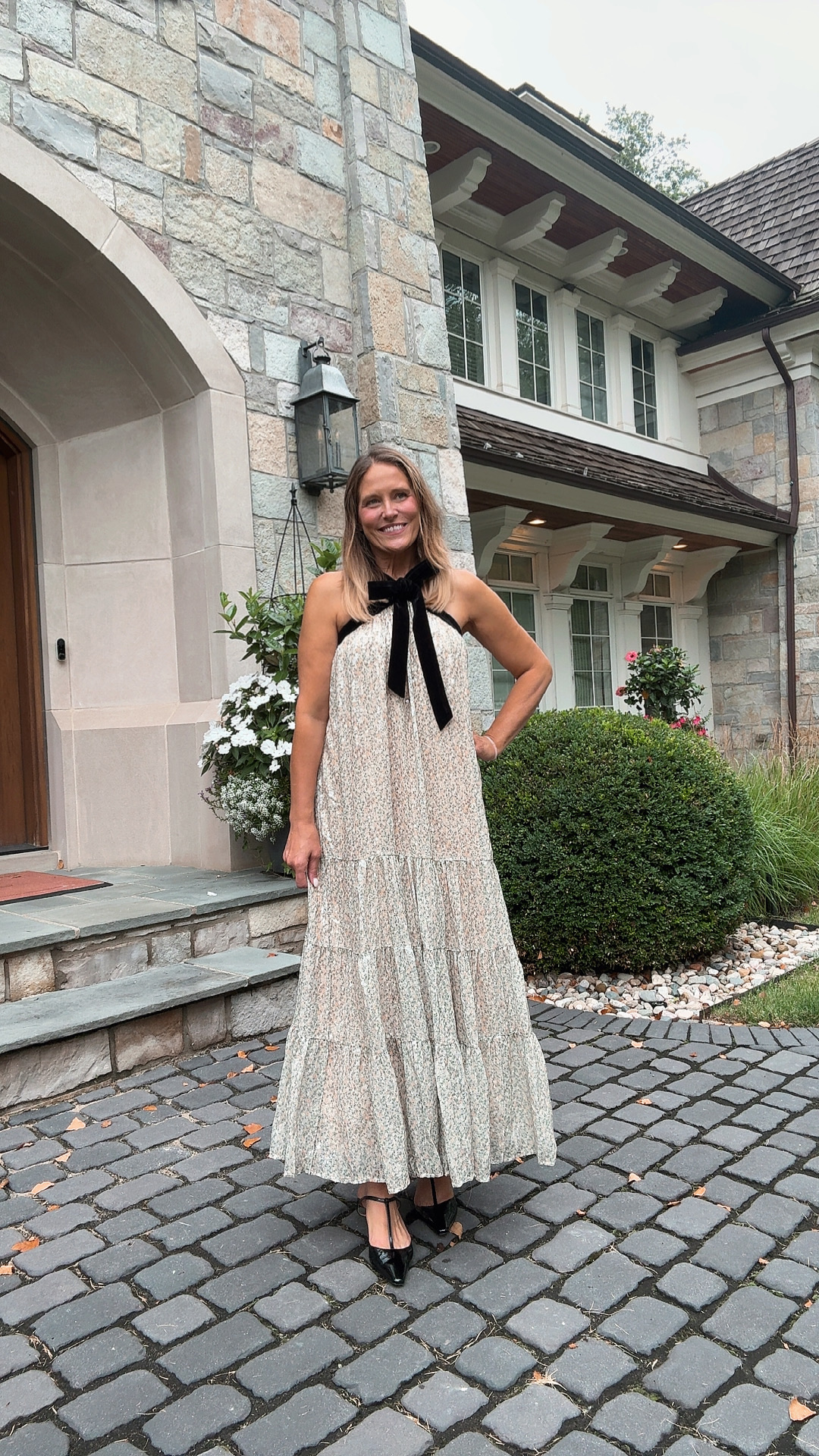 This bow-tie floral maxi has such a playful yet polished feel, making it an easy choice for daytime or outdoor fall weddings. The tiered skirt moves beautifully, while the oversized black bow adds just enough drama without feeling over the top. I’d pair this with block-heeled sandals if you’ll be on grass or cobblestones, or with a classic pointed flat for comfort that still looks dressy.