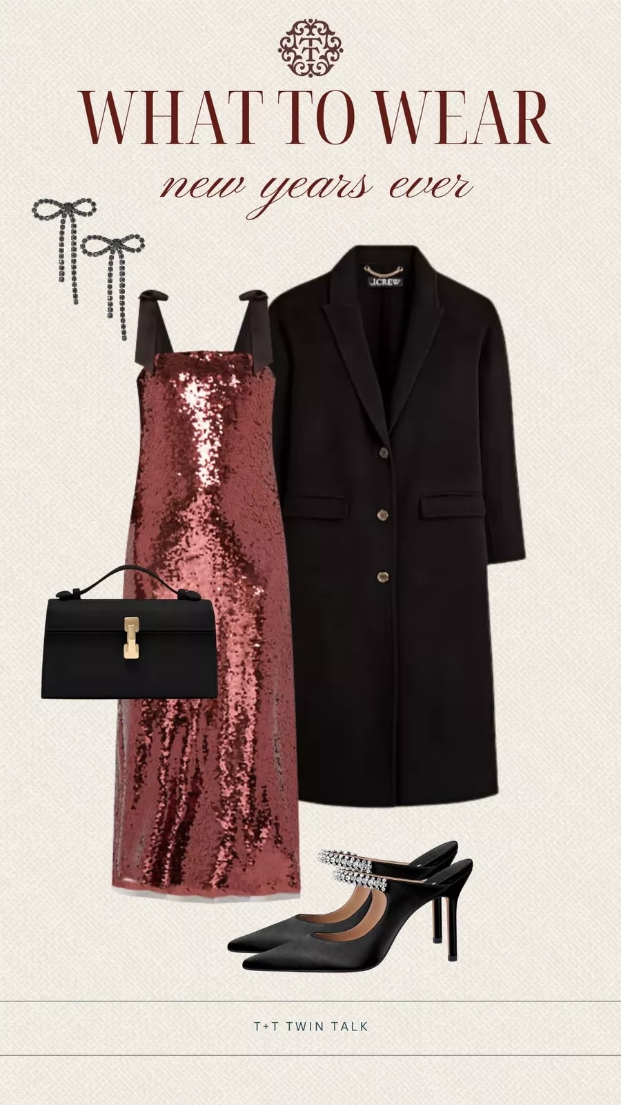 A black sequin dress is just such a classic NYE move and we fully support it. We love pairing it with a bold coat for a little color and warmth. Add statement earrings, and you’re basically the disco ball of the night in the best way. It’s one of those outfits that truly doesn’t need much styling. The dress does the work for you. We love this if you’re going somewhere fun and want a true “New Year’s Eve” moment.