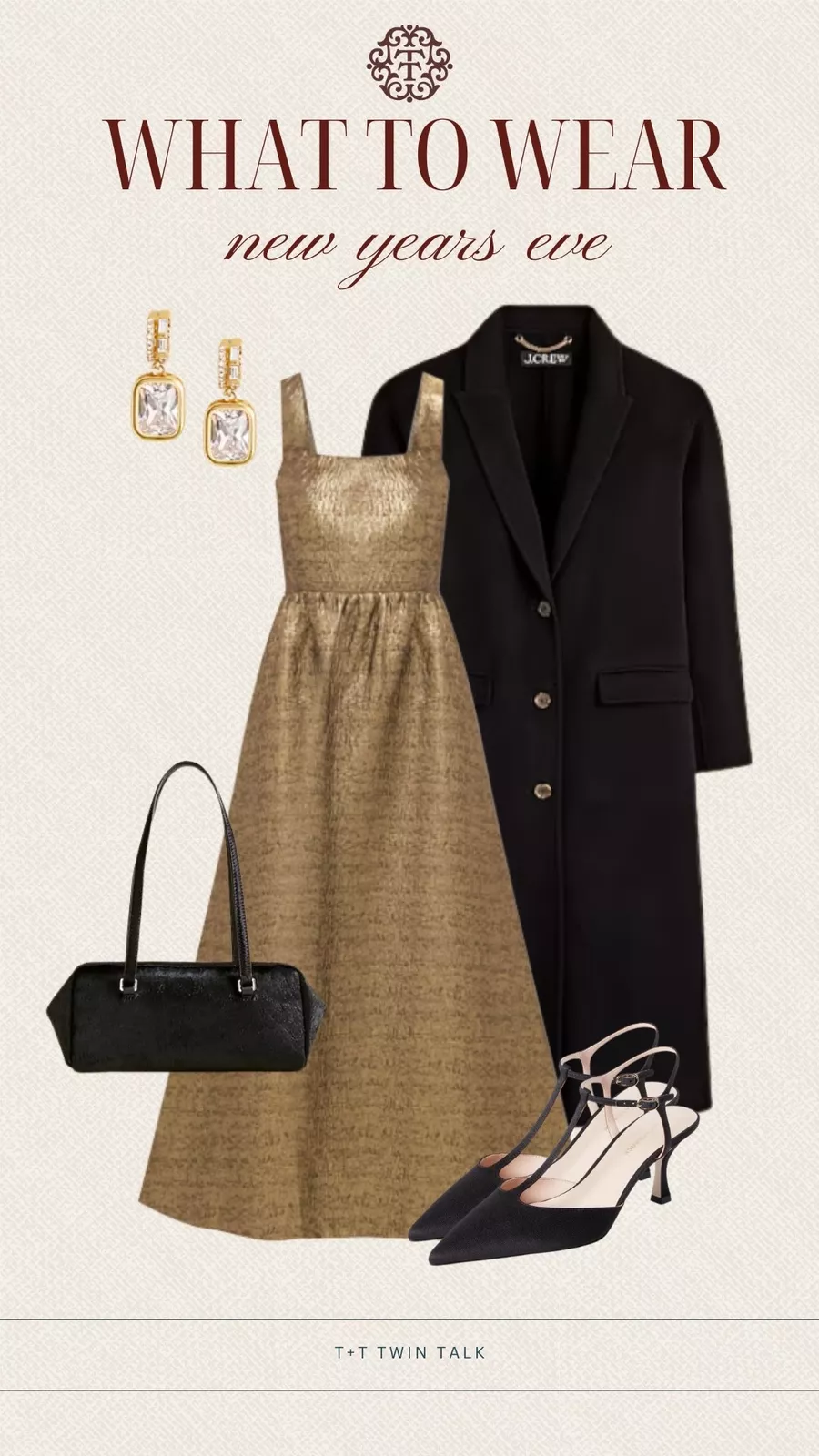 We love how this gold midi dress instantly feels special without being over the top. The black coat keeps it polished and warm, so we can still look cute even when it’s freezing outside. Add slingbacks and simple jewelry and we’re ready for dinner, a party, or watching fireworks. We love this especially if you want to feel dressed up but still like yourself, not in a costume. New Year’s Eve outfit ideas like this are perfect if you want sparkle but still love classic pieces.