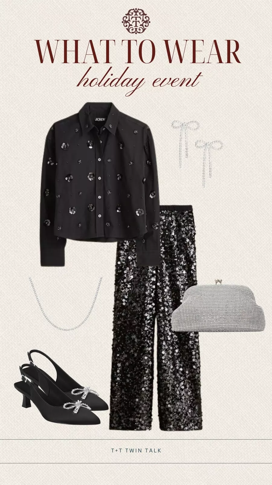 We love a good party-pant moment. Sequin trousers are such a fun alternative to a dress and are surprisingly easy to style. Add an embellished top and you’re sparkling from head to toe with minimal effort. This is perfect if you like being comfortable but still want all the shine. If you love separates, this is one of our favorite New Year’s Eve outfit ideas to try.