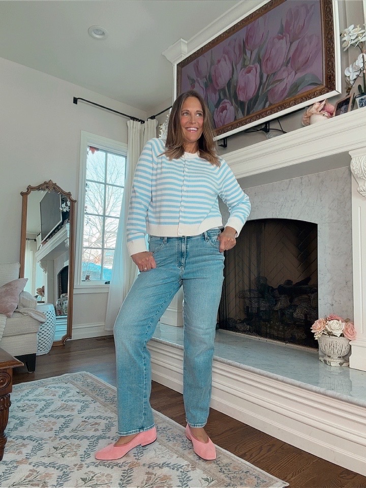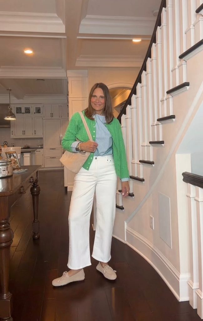 This look is such a fresh spring combination. The green cardigan layered over the striped top paired with white jeans feels bright, classic, and easy to wear. We love this look for lunch with friends, casual meetings, or a day out running errands when you still want to feel a little put together.