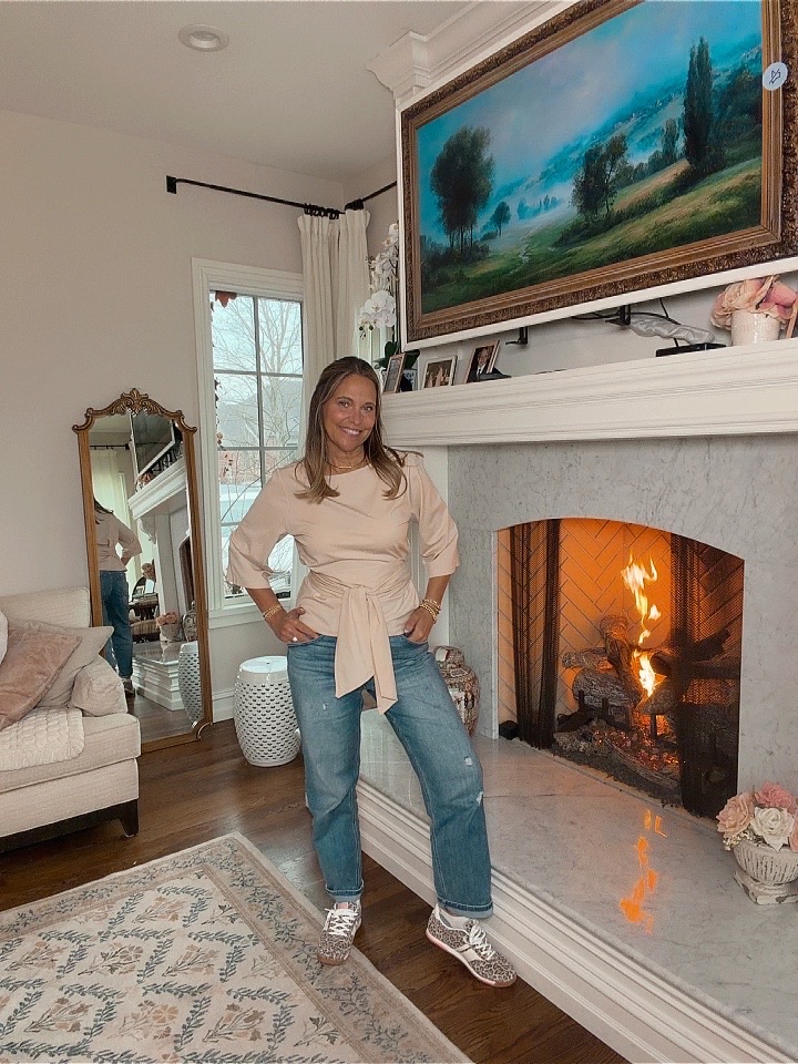 This is the kind of outfit we find ourselves wearing all the time. The tie top paired with classic blue jeans is simple, easy, and works for so many different things. We’d wear this for errands, casual meetings, or even a relaxed dinner. Add a flat sandal or sneaker and it’s the kind of outfit you’ll reach for over and over.