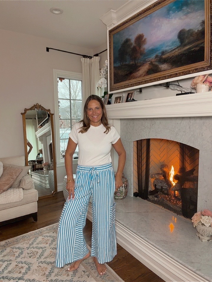 These striped pants are one of those pieces that instantly make an outfit feel fun for spring. Paired with a simple white tee, it’s an easy look that feels relaxed but still put together. We love outfits like this for brunch, weekend plans, or even packing for a spring getaway since they’re comfortable and easy to style with sneakers, sandals, or flats.