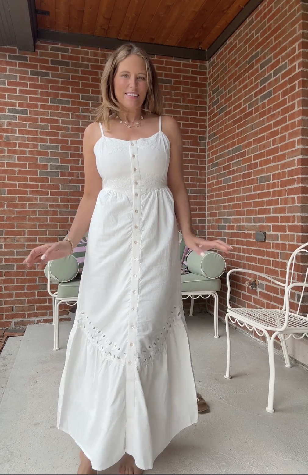 Nothing says effortless summer like a crisp white maxi dress. We love this one for its delicate button details, feminine embroidery, and flowy silhouette that feels like a dream on a hot day. It’s the kind of dress you can wear barefoot at the beach or dress up with sandals and a woven bag for brunch with friends. A true summer staple.