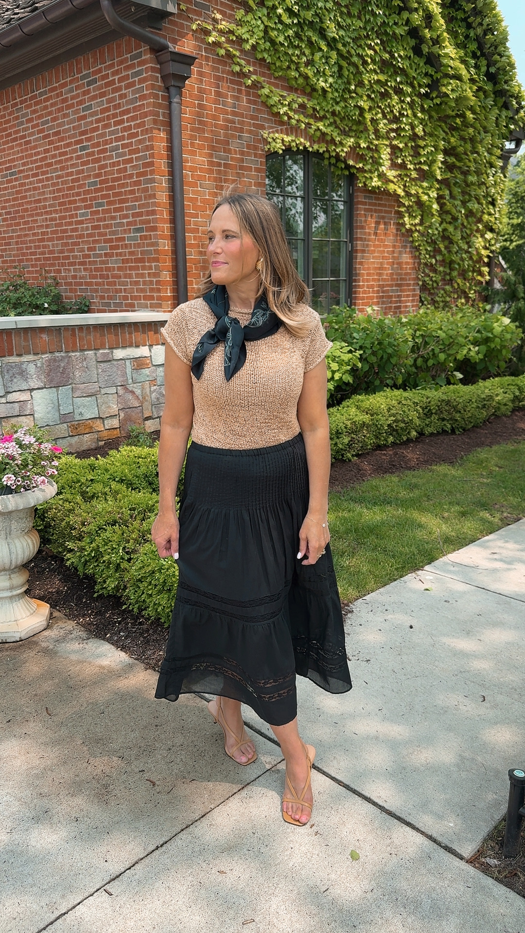 She’s polished, but not trying too hard. Think breezy elegance with just a hint of prep. This look captures it perfectly: a soft, sun-kissed knit top, floaty black skirt with lace detailing, strappy sandals, and a tied scarf for that windswept-by-the-sea charm. It’s relaxed, refined, and ready for a rosé spritz on the porch.